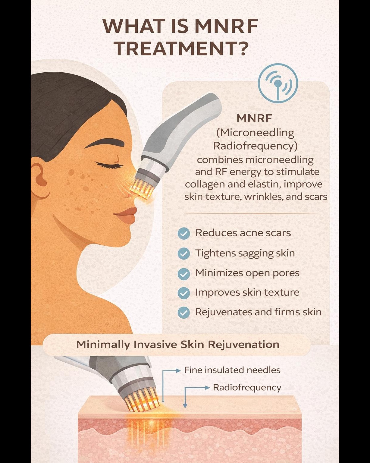 Microneedling Radiofrequency (MNRF) is a modern, minimally invasive skin treatment that targets concerns like acne scars, enlarged pores, uneven texture, and early skin laxity. It uses fine insulated needles to deliver controlled radiofrequency energy into the deeper layers of the skin, stimulating collagen and elastin production. This helps improve skin firmness, refine texture, and promote a smoother, healthier appearance over time. The procedure involves minimal downtime, with mild redness for a short duration. A course of multiple sessions is typically advised for best and sustained results. indications- Acne scars (especially atrophic, rolling, boxcar) Enlarged/open pores Skin laxity and mild sagging Fine lines and early wrinkles Uneven skin texture Stretch marks (striae) Overall skin rejuvenation • MNRF treatment in Wakad, Microneedling Radiofrequency Wakad, RF microneedling PCMC, Acne scar treatment Wakad Pune Skin tightening treatment Wakad, Open pores treatment PCMC